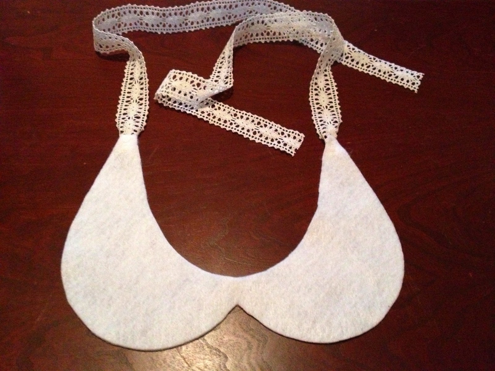 So, the supplies you'll need: Paper, felt ($0.25 each), sequins & lace trim ($1.50 each after 50% off sale), tacky glue ($2.47), pencil, needle and thread. I purchased most of my supplies from Hobby Lobby.